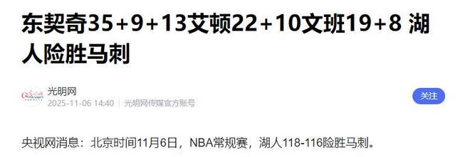 北京时间11月6日,NBA常规赛上演一场逆转大戏,湖人118-116险胜马刺。