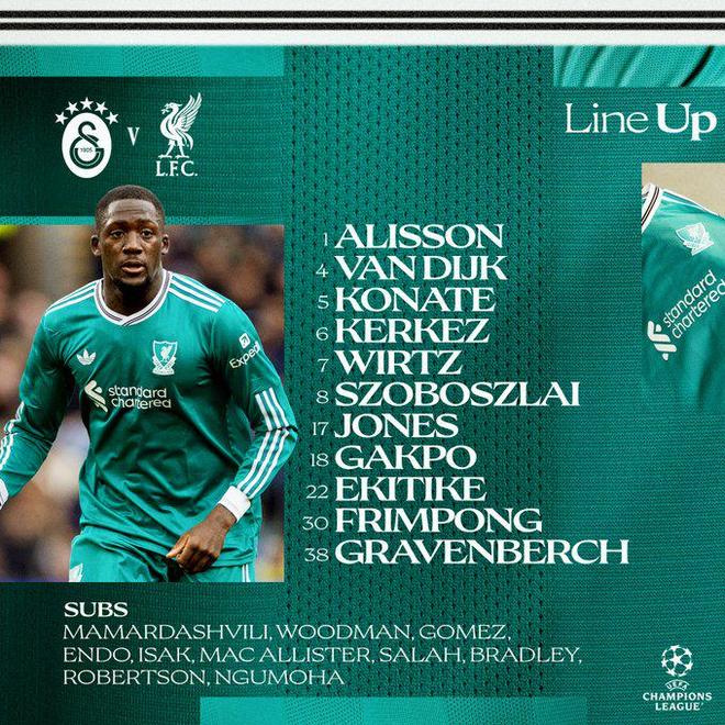 雷速体育10月1日讯 今日凌晨3:00,25/26赛季欧冠联赛阶段第2轮将迎来一场焦点对决,加拉塔萨雷在主场迎战红军利物浦。目前,两队的首发阵容已出炉。